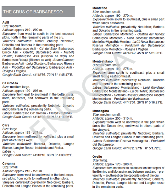 a brief fact sheet for each cru, including: overall size, altitude, exposure, grapes varieties cultivated, wines produced, Google Earth coordinates.