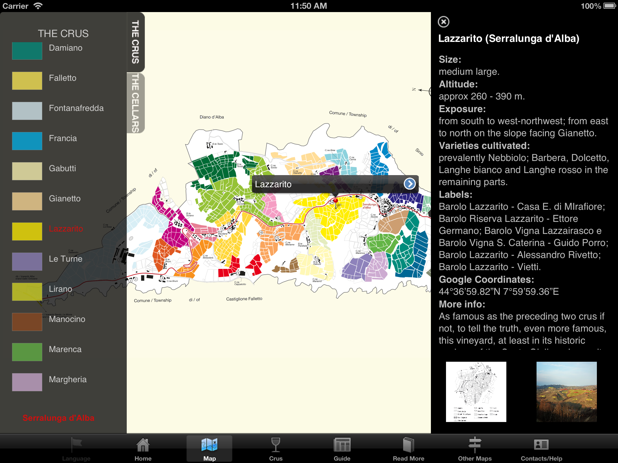 An indispensabile tool for all those who truly love Barolo and the wines of Piedmont! The vineyard maps “I Cru di Enogea”, now finally available on iPad, maps which have won the enthusiastic appreciation of both critics and connoisseurs from all over the world. Fifth release: Serralunga 2013 Edition Discover, rapidly and directly, each and every aspect of the crus which are part of the history of Barolo (Vignarionda, Francia, Gabutti, Arione, Lazzarito…).