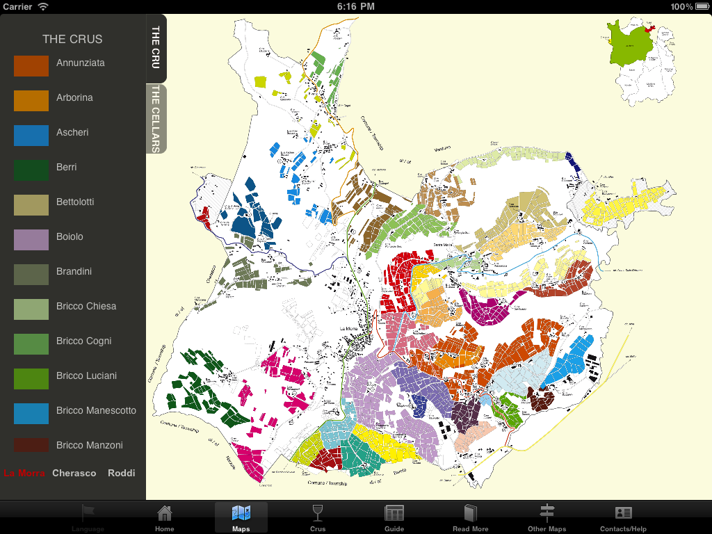 Colored interactive map of the vineyards of the townships of La Morra , Cherasco, and Roddi