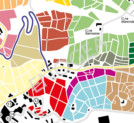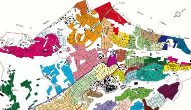 planimetria in bianco e nero della menzioni con indicati, vigneto per vigneto, i singoli proprietari