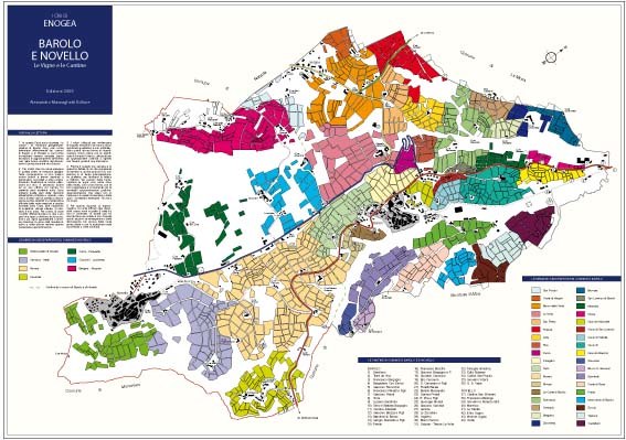 (i colori evidenziano le diverse menzioni ufficiali riconosciute per i comuni di Barolo e di Novello)