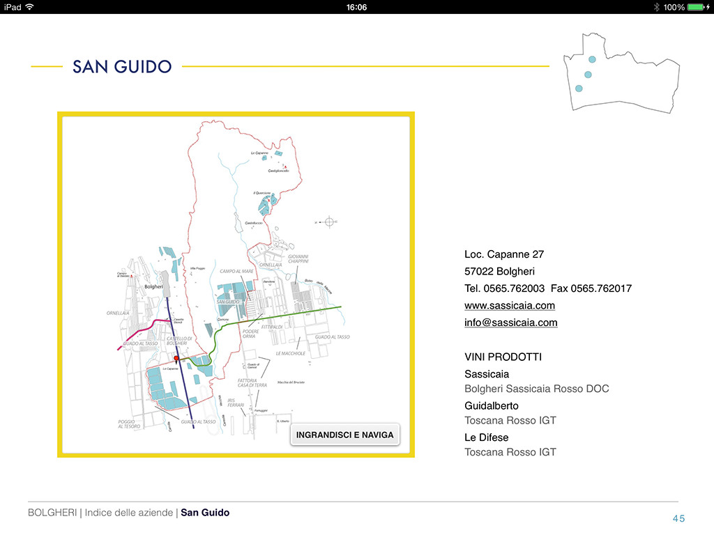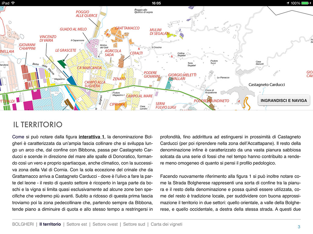 Sassicaia, Ornellaia, Le Macchiole, Grattamacco non avranno più segreti grazie a testi di approfondimento dettagliati e a una serie di cartine interattive che vi consentiranno di esplorare tutti i vigneti della denominazione, valutare le altimetrie e approfondire l’orografia del territorio e dei diversi settori che lo compongono.
