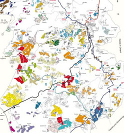 (i colori evidenziano i vigneti delle singole aziende attive sui tre territori comunali)