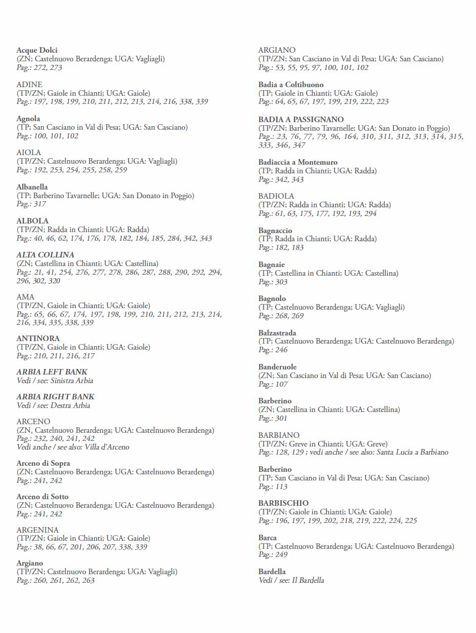 In appendice un ricco dizionario dei toponimi e delle aziende, con l’elenco aggiornato dei Chianti Classico da esse prodotti e delle UGA in cui hanno vigneti.