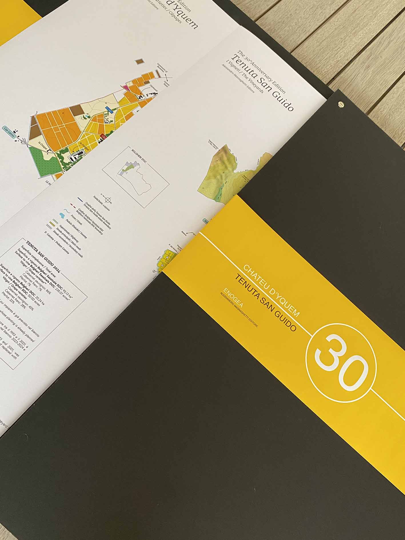 6 mappe mai pubblicate in precedenza da nessun editore dedicate a due proprietà che hanno fatto la storia del vino in Italia, in Francia, nel mondo: Château d’Yquem e Tenuta San Guido (Sassicaia)