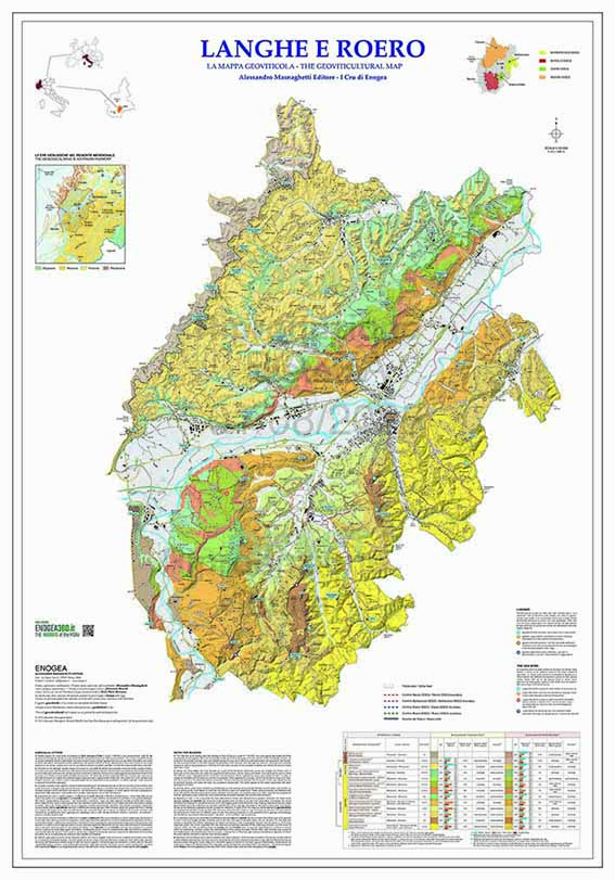 La mappa che completa la trilogia delle carte geoviticole dell’Albese. Copre le aree di Barolo (incluse le parti dei comuni di Monforte d’Alba e di Novello non incluse nella DOCG), Barbaresco, Diano d’Alba e Roero. Include una mappa semplificata della geologia del Piemonte meridionale, una tabella con le caratteristiche dei suoli e i geositi.