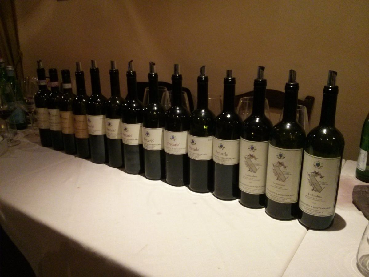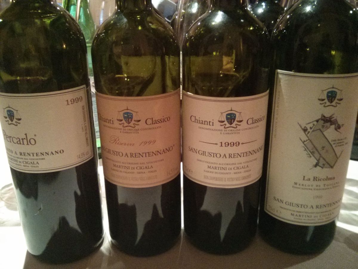 C’è voluto un po’ di tempo per lasciar sedimentare le tante e per nulla lineari sollecitazioni scaturite in uno splendido sabato di inizio febbraio. Quando ci siamo trovati al ristorante San Giorgio di Umbertide con altri amici per onorare la bella degustazione allestita da Ezio Bani, molto più di un giovane e competente enotecaro. Il suo profilo per molti versi fuori dagli schemi è ben raccontato da Antonio Boco nel post pubblicato più “a caldo” su Tipicamente, al quale vi rimando anche per i flash pienamente condivisi sugli assaggi più interessanti emersi durante l’articolata ricognizione sul tema San Giusto a Rentennano. Una sorta di “diagonale” anarchica, con diverse annate delle etichette più conosciute ed apprezzate prodotte dall’azienda di Gaiole in Chianti, appartenente dal 1914 alla famiglia Martini di Cigala. Senza un apparente ordine tematico e temporale, ma con un continuo avanti e indietro tra l’oggi e il recente passato, tra i merlot de La Ricolma e i Chianti Classico (il “base” e la selezione Le Baroncole Riserva), passando per il sangiovese in purezza del Percarlo, proposto in gamma dall’annata 1983 e da molti considerato uno dei più importanti supertuscan di “seconda generazione”.